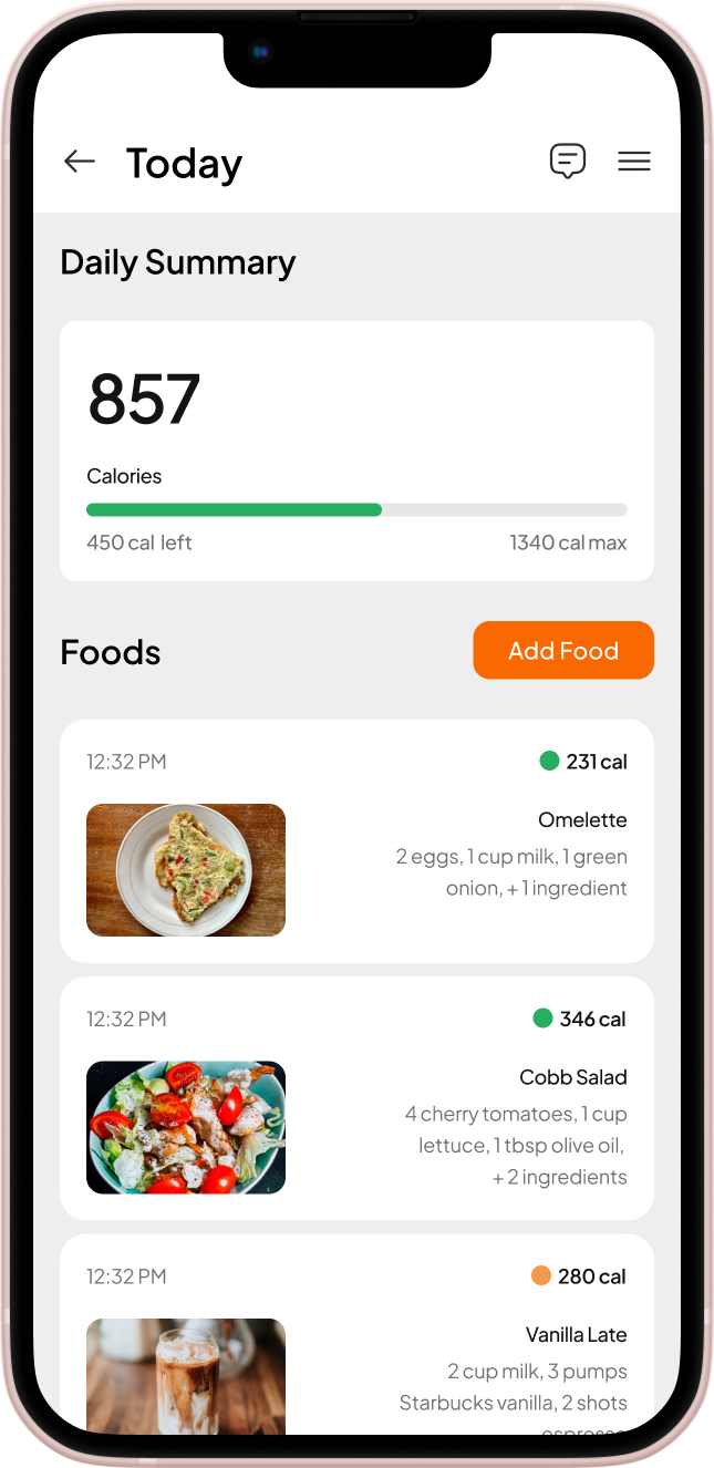 On this page, the user can see an overview of all the foods they’ve eaten and manage their daily calorie budget. It helps to see photos of all the foods for the day in order to reflect on food intake quality.