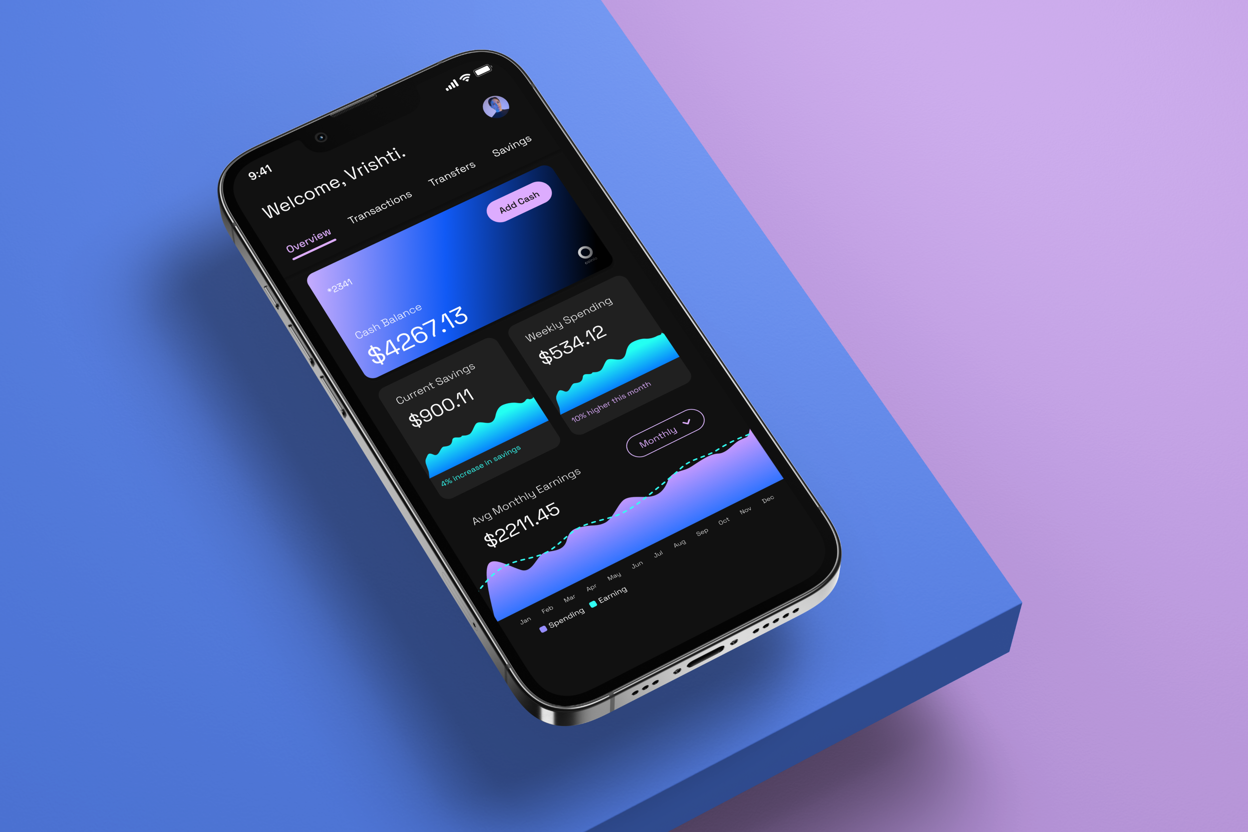 This is the place where the user can get a quick idea of their money habits every single day. They are able to see their card balance, current savings, weekly spending, and spending vs earning.