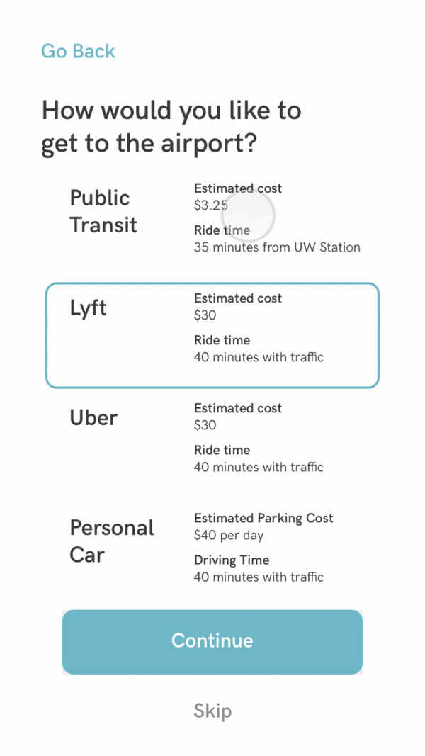 Based on your flight details, we help you personalize your pre-flight journey by asking you where you are leaving from and how you are getting to the airport. Then, we give you options on when to leave for the airport so that you can be on time!