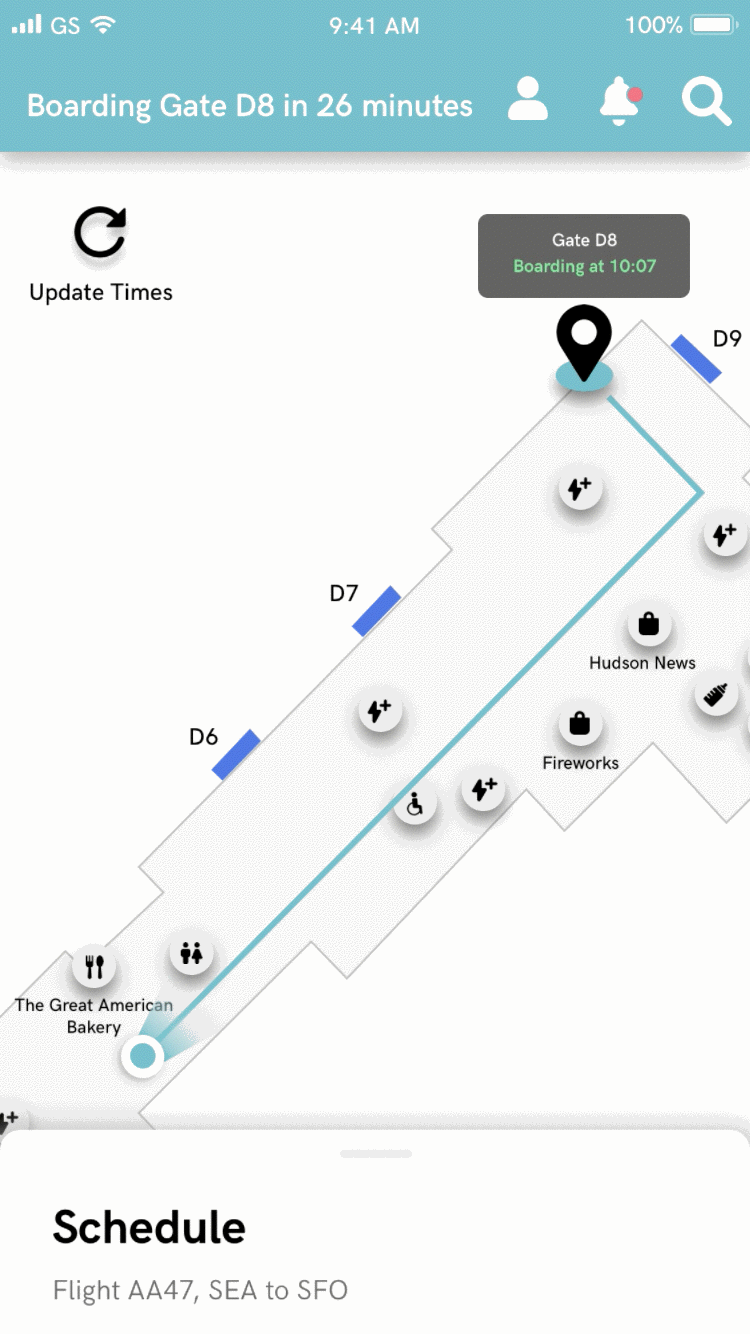 Based on the onboarding information, users will always have access to a personalized schedule from the moment they leave their house to boarding their flight. This ensures that users have a sense of control and time management.